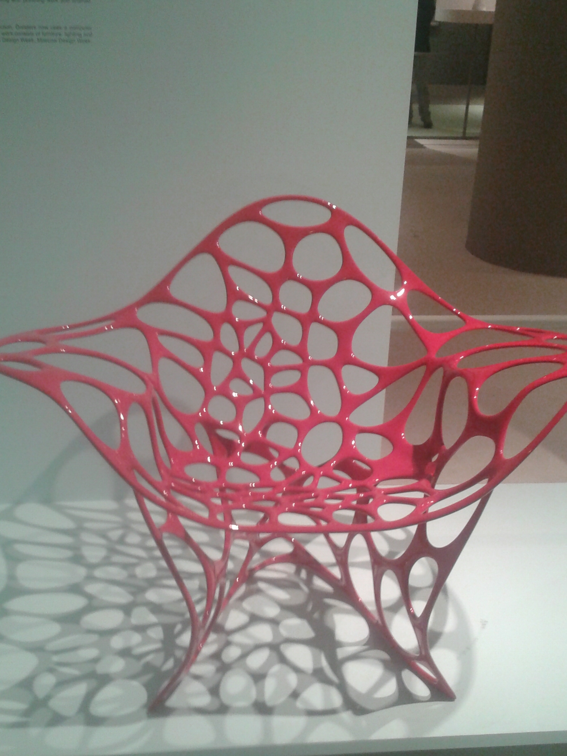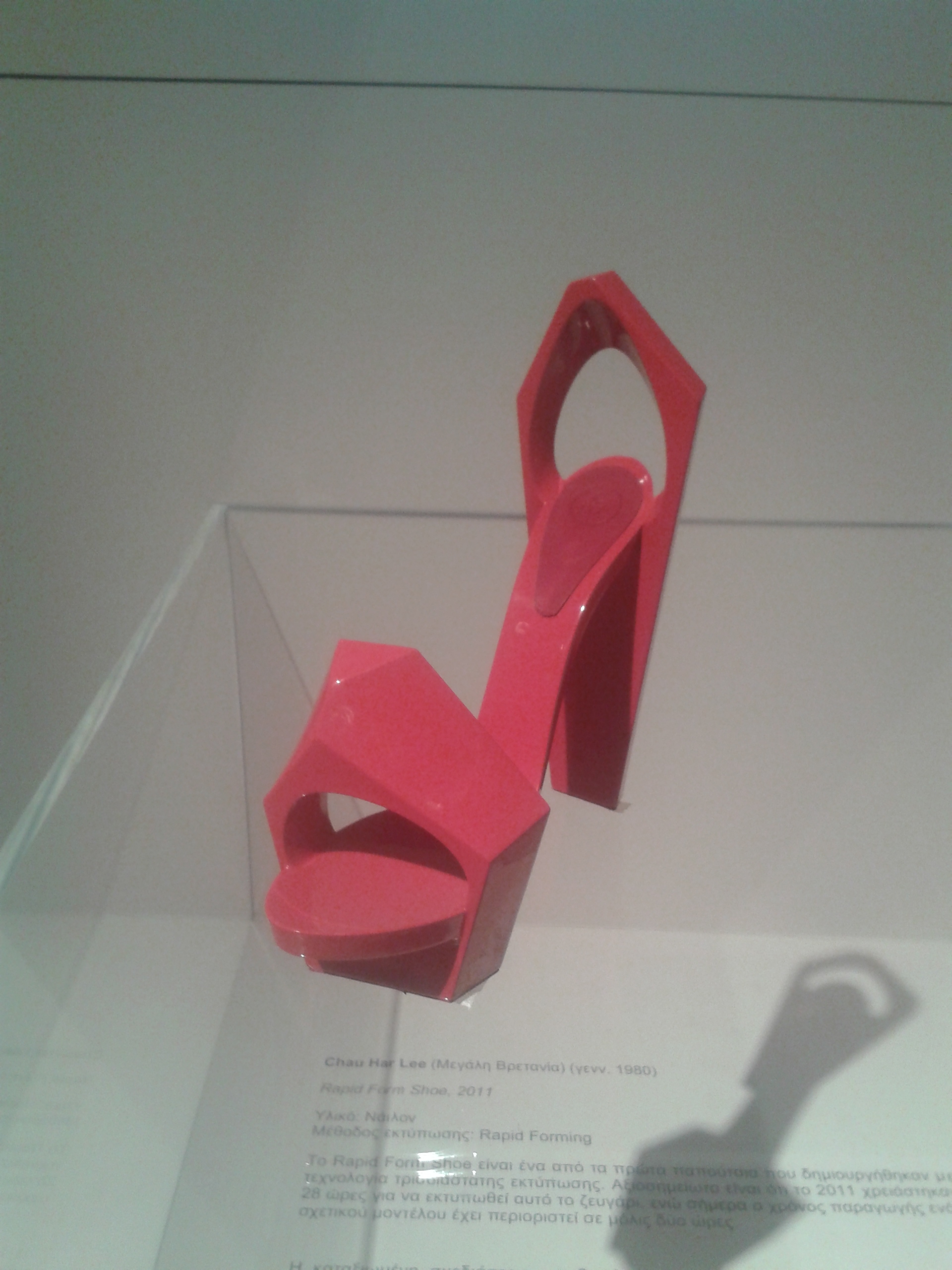 Ευκαιρίες τέτοιες δεν χάνουμε, οπότε, μια Κυριακή βρεθήκαμε στο κτίριο- κόσμημα της Στέγης στη Συγγρού για να δούμε την έκθεση, γεμάτοι περιέργεια, να αντικρύσουμε από κοντά τα εκτυπωμένα αντικείμενα. Βρεθήκαμε σε μια επανάσταση. Πατώντας το πόδι σου στην έκθεση είναι σαν να διεισδύεις στο μέλλον. Η έκθεση ξεκινάει με μια βιντεοπροβολή στην οποία ένας τεράστιος εκτυπωτής εκτυπώνει έπιπλα, τοποθετώντας διαδοχικές στρώσεις από ένα ρευστό υλικό που βγαίνει σαν να ζουλάς μια οδοντόπαστα και αμέσως μετά αρχίζουν να σου αποκαλύπτονται στην αίθουσα, τα έπιπλα, ένα αυτοκίνητο, κοσμήματα, παπούτσια, ρούχα, καπέλα, αντικείμενα τέχνης, το πρότζεκτ ενός εκτυπωμένου κτιρίου που θα φέρει επανάσταση στην αρχιτεκτονική και στην κατασκευή των κτιρίων.